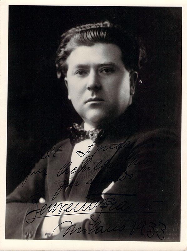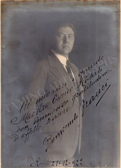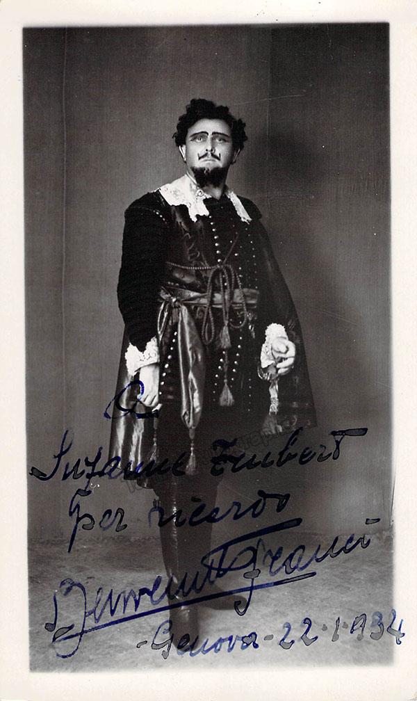 Signed photo postcard, shown as Renato in Ballo in Maschera. Inscribed and signed in Genoa in 1934. Stamped on verso by photographer C. Gerardi, Verona. Size is 3.75 x 6.25 inches, in excellent condition.