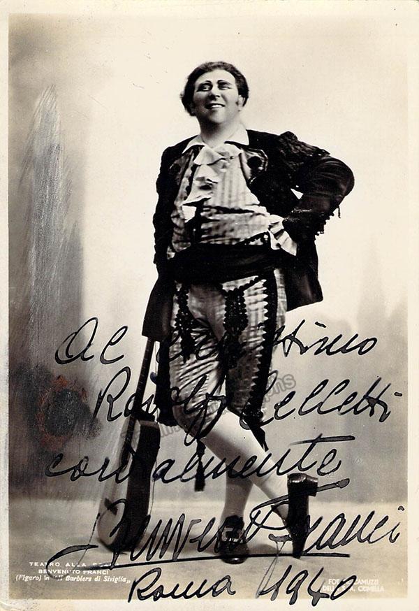 Signed photo postcard, shown as Figaro in Rossini's Barbiere di Siviglia at La Scala. Inscribed and signed in Rome in 1940. Photo by Camuzzi, Milan. Size is 4 x 6 inches with some wear on edges but otherwise in excellent condition.