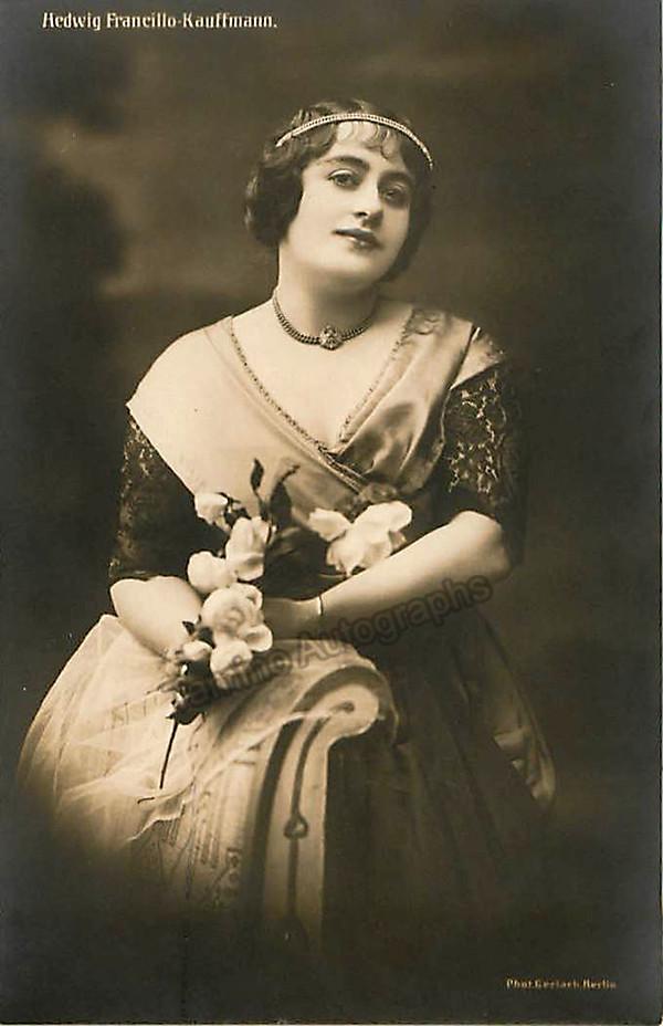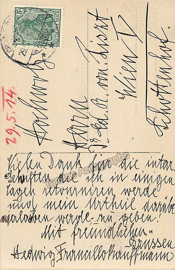 Signed photo postcard of the Austrian soprano (1878-1948), shown as herself, stamped on verso and dated in 1914. Size 3.5 x 5.25 inches.