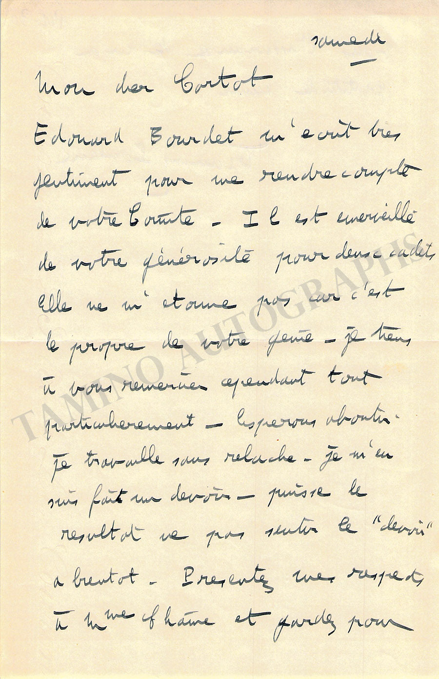Autograph letter in French (untranslated) signed by him, no year indicated, to the French pianist Alfred Cortot. Each page's size is 5.25 x 8.2 inches, 2 written pages in one sheet (front and back), central fold, in excellent condition.
