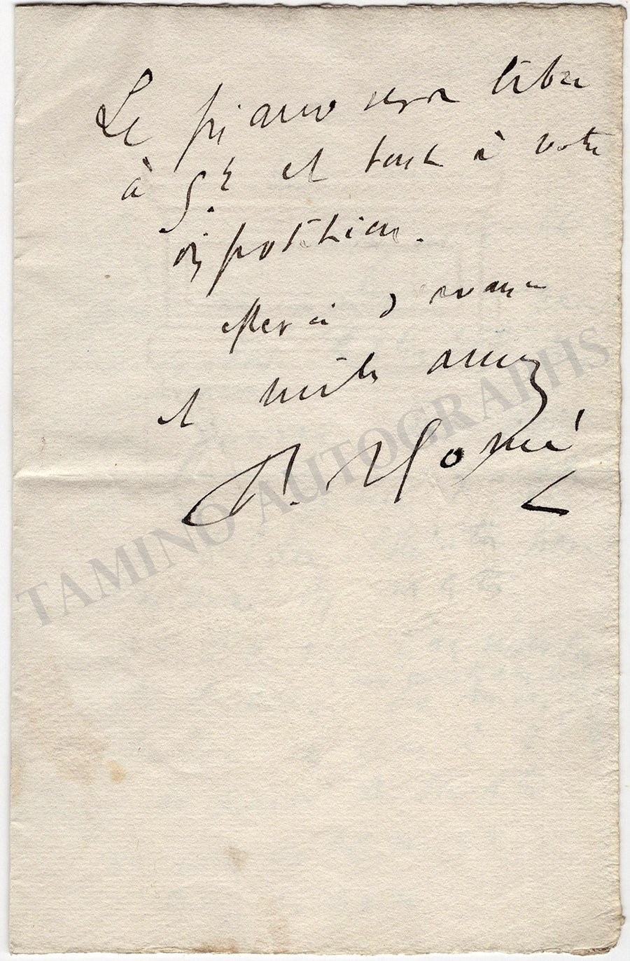 Autograph letter in French (untranslated) signed by him, no date, addressed to the pianist and composer Georges Pfeiffer (1835-1908): “…Seriez-vous assez aimable pour me faire envoyer ce matin le plus tôt que vous pourrez, un petit piano à queue…”.