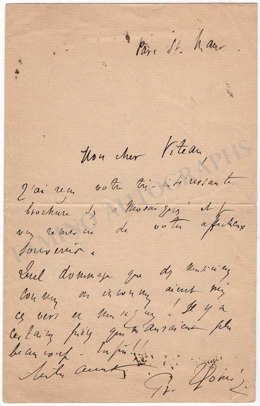 A. Parc St.Maur [Créteil]. To the poet Paul Viteau, whose poems such as “Chanson cosaque” were put in music by the composer: “…J’ai reçu votre très interessante brochure des “Mosaïques” et je vous remercie de votre affectueux souvenir…”. 1 p. In-8. B.