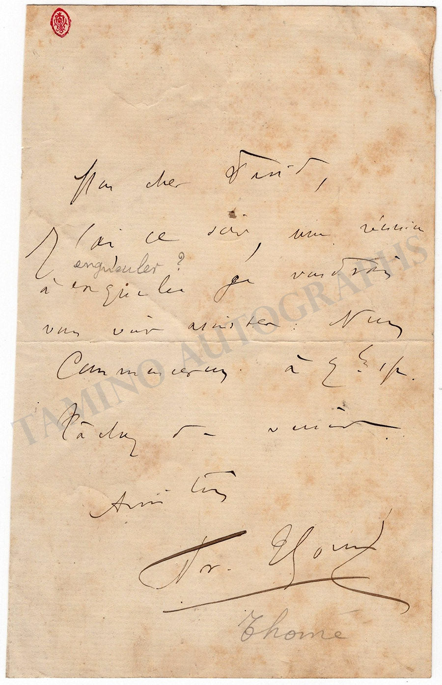 Not dated. To the composer Adolphe David (1842-1897): “…J’ai ce soir, une réunion à engueler [?] je voudrais vous voir assister…”. 1 p. In-8.