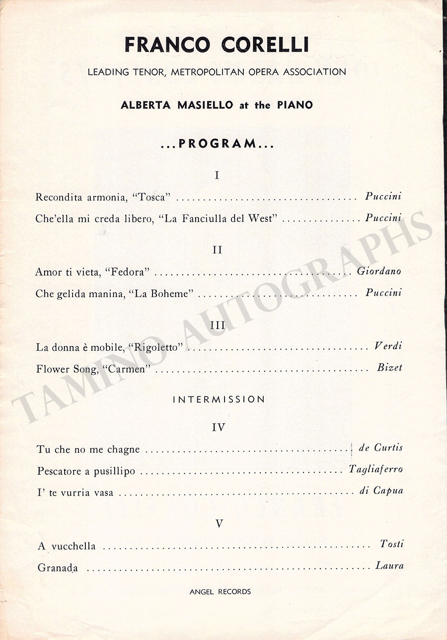 Corelli, Franco - Signed Recital Program Englewood 1962 Corelli, Franco - Signed Recital Program Englewood 1962 Corelli, Franco - Signed Recital Program Englewood 1962
