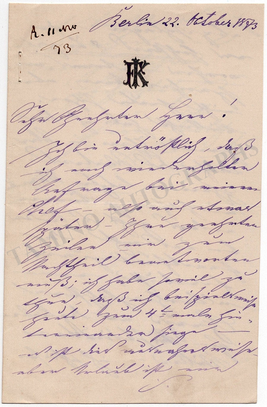 Autograph letter in German (untranslated) signed by him, dated October 22, 1893, where he addresses a gentleman regretting not having obtained the permit to leave Berlin and says that they will have only brief meetings during the winter. Size is 4.7 x 7.2 inches, 3 written pages, printed monogram at the top, in very good condition.
