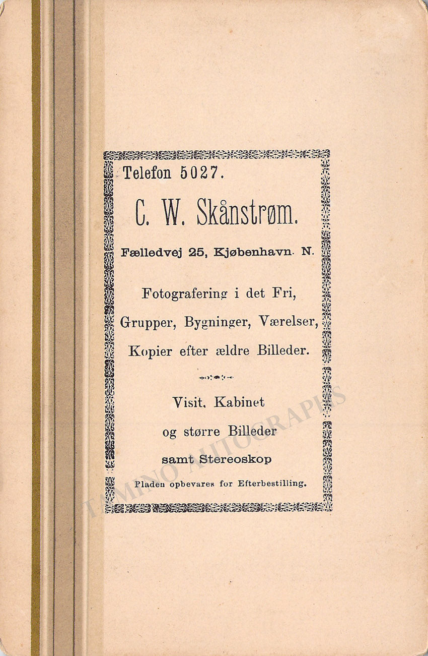 Gorgeous (unsigned) cabinet photograph of the composer in his elder years by C.W. Skanstrom (Copenhagen), blind-stamped on the front and printed on verso by the photographer.  Size is 4.2 x 6.5 inches, in very good condition.
