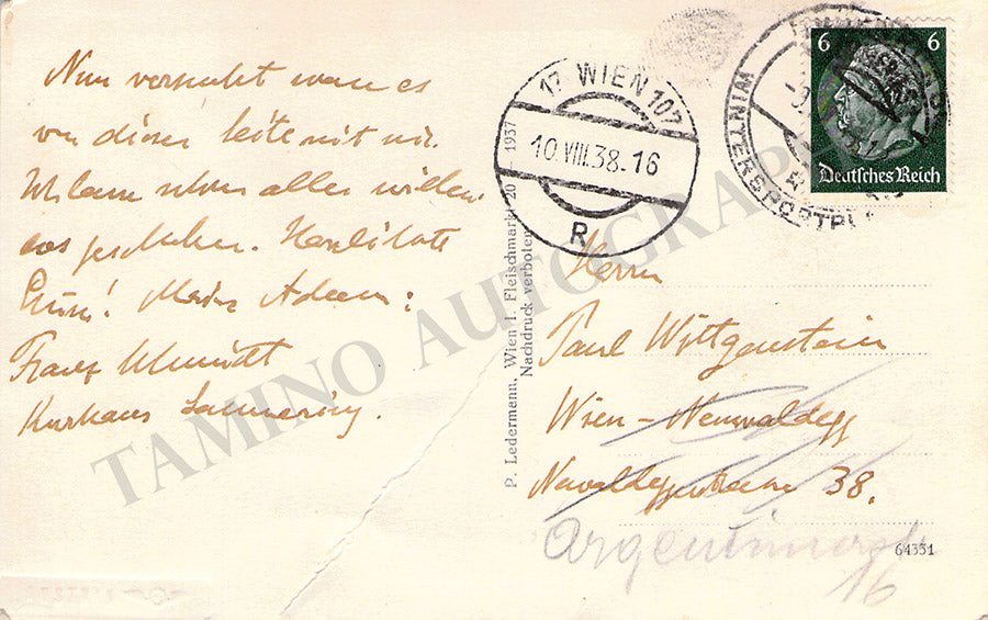 Autograph note on a postcard written in German (sold untranslated) signed by the composer, no date (postal marks indicate the date August 10, 1938), addressed to pianist Paul Wittgenstein.  Size is 5.4 x 3.4 inches, crease across, otherwise in very good condition.
