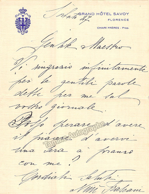 Autograph note signed on the stationary of the Grand Hotel Savoy, Florence, 1 page of a folded 4-page document, written in Italian, sold untranslated. Size of each page is 5.75 x 7.25 inches, in excellent condition.