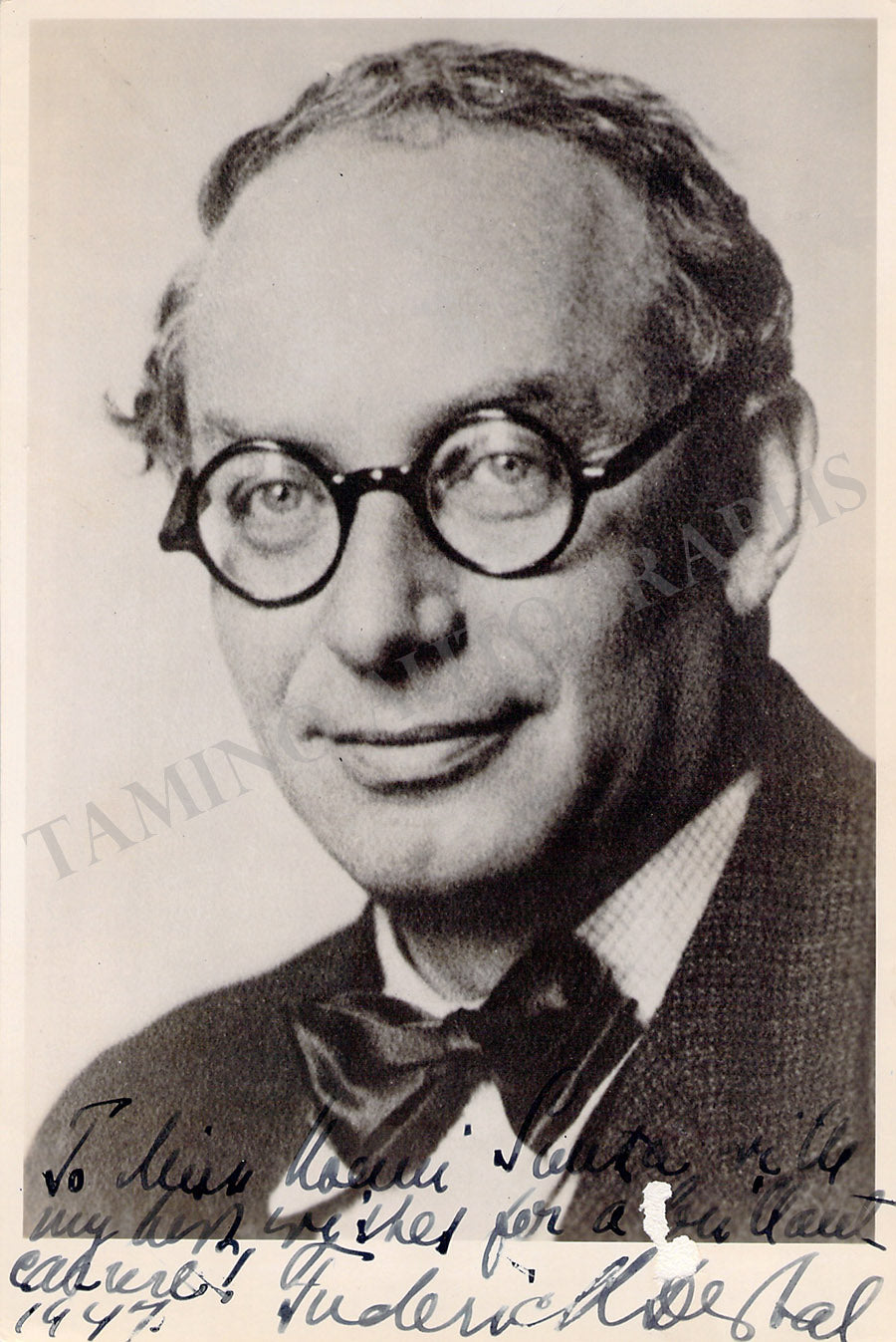 Black-and-white photograph signed and inscribed by him with a short sentiment, shown as himself; ink-stamped on verso by photographer Carmen (Buenos Aires). Size is 4.6 x 7 inches, small damage on the surface over the inscription, in overall good condition.