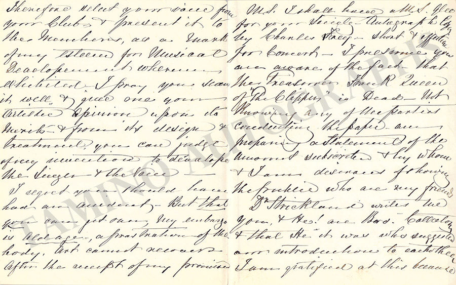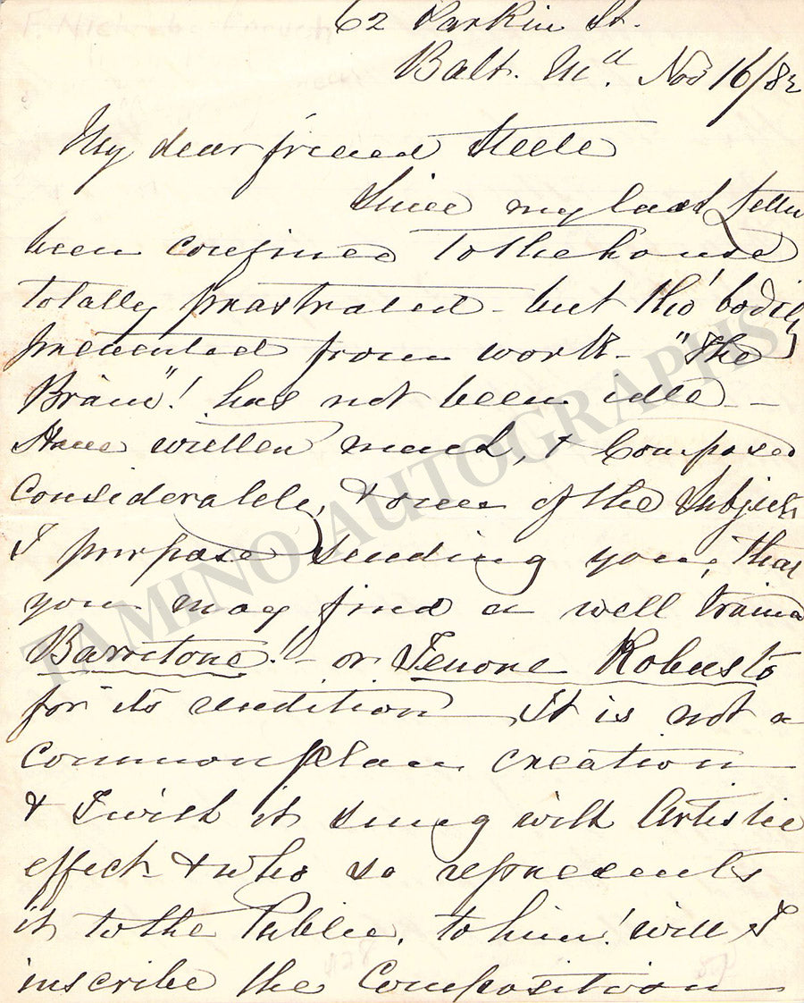 «...Since my last letter [I’ve] been confined to the house. Totally prostrated but though bodily prevented from work, “The Brain!” has not been idle – Have written much & composed considerable, & one of the Subjects I propose sending you, that you may find a well trained Baritone! Or Tenor Robusto for its rendition. It is not a common piece creation * I wish it was sung with Artistic effect & who so represents it to the Public, to him! Will I inscribe the composition...».