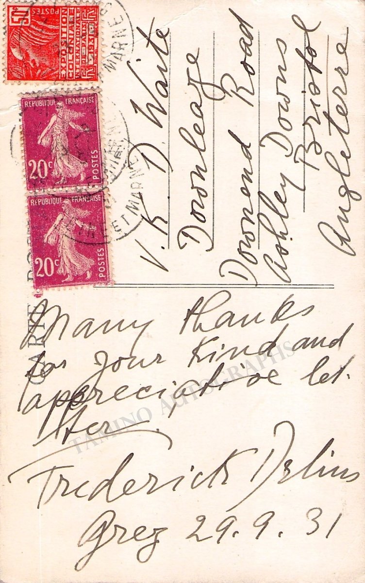 Delius, Frederick - Signed Postcard 1931 - Tamino Delius, Frederick - Signed Postcard 1931 - Tamino
