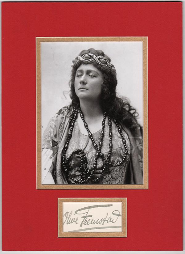 Swedish-born soprano/mezzo-soprano (1871-1951), one of the most famous Wagnerian signers in the earliest years of the 20th century.  Signature from an autograph album, matted with a nice photo of her, shown in role. Total mat size is 9.5 x 13 inches, signature is 3.6 x 2 inches (visible window size), photo window is 6 x 8 inches. Double mat, in excellent condition.