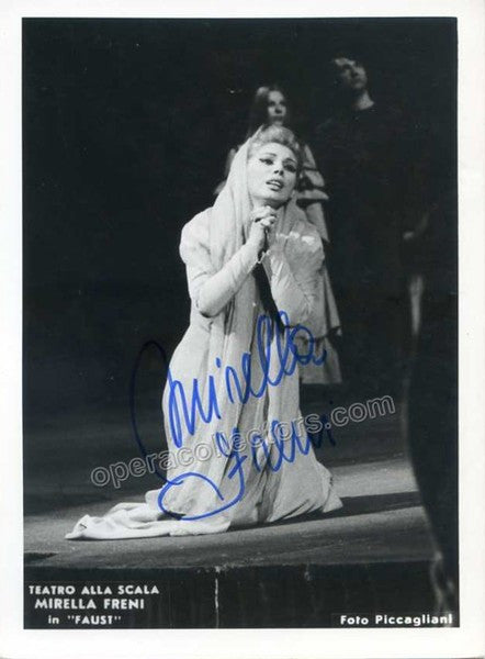 Star italian soprano. Freni is much admired for her youthful voice and her acting skills. Signed Photo as Marguerite in Faust, 4.25 x 5.75 inches, gorgeous photo from Teatro La Scala
