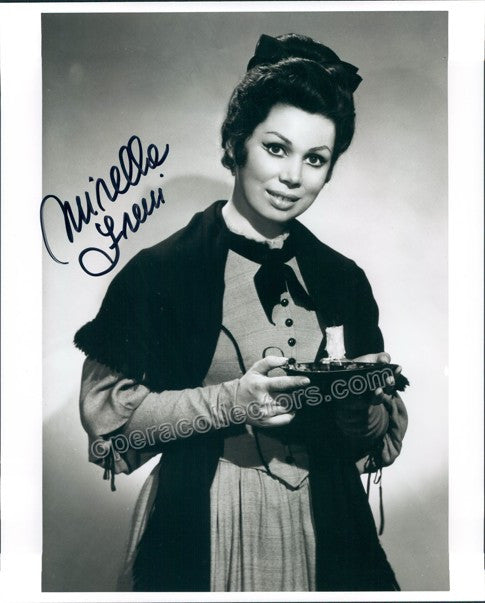 Star italian soprano. Freni is much admired for her youthful voice and her acting skills. Signed photo, shown as Mimi in La Boheme at the Met Opera, 8 x 10 inches