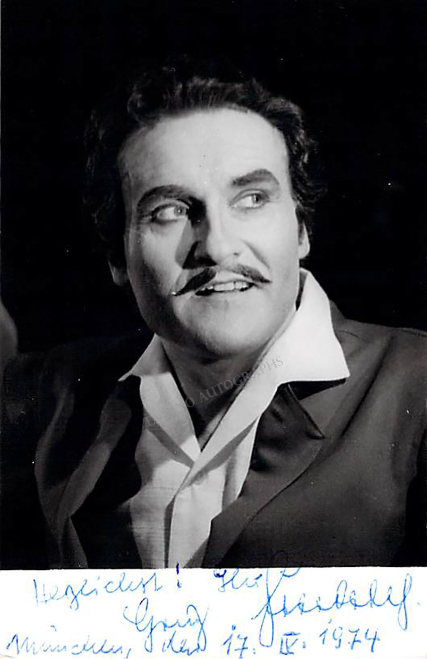 German baritone (1921-1983), signed photograph, shown in role in Lortzig's Zar und Zimmermann, inscribed in Munich, dated in 1974. Stamped on verso by photographer Theo Gobel, Munich. Size is 3.5 x 5.5 inches, in very good condition.