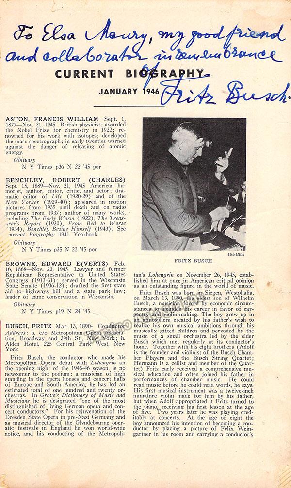 Busch, Fritz - Signed Photograph 1946 & Page - Tamino Busch, Fritz - Signed Photograph 1946 & Page - Tamino
