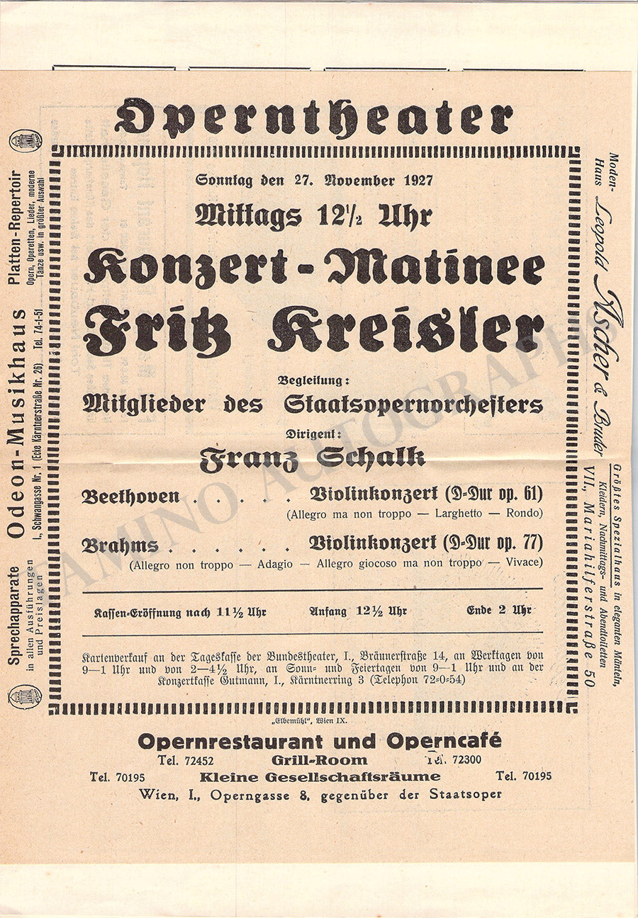 Unsigned concert program for a performance of Beethoven and Brahms violin concertos by the famed Austrian violinist in Vienna on November 27th, 1927.