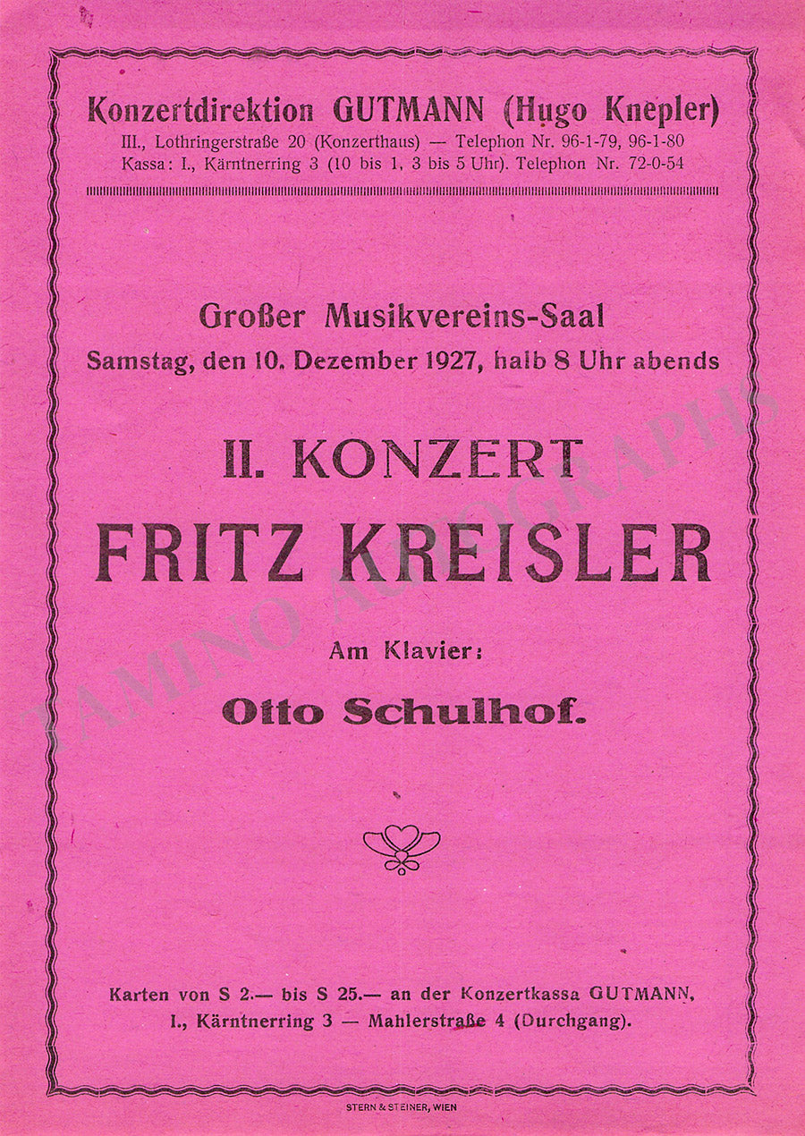 Kreisler, Fritz - Concert Program Vienna 1927 Kreisler, Fritz - Concert Program Vienna 1927 Kreisler, Fritz - Concert Program Vienna 1927