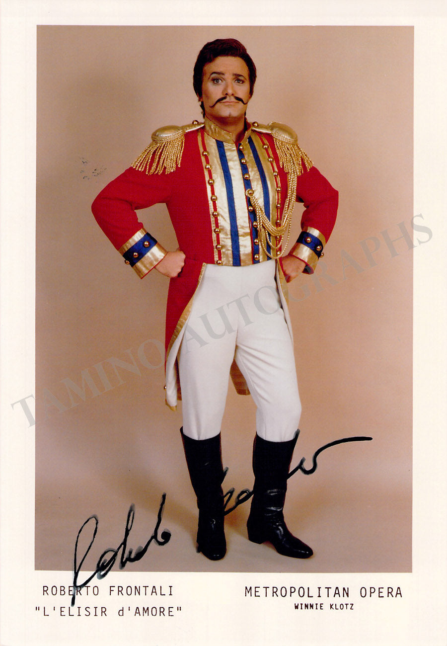 Italian baritone (b. 1958), shown as Belcore in Donizetti's L'Elisir D'Amore. Photo by Winnie Klotz, Metropolitan Opera, New York. Size is 5 x 7.25 inches, in excellent condition.