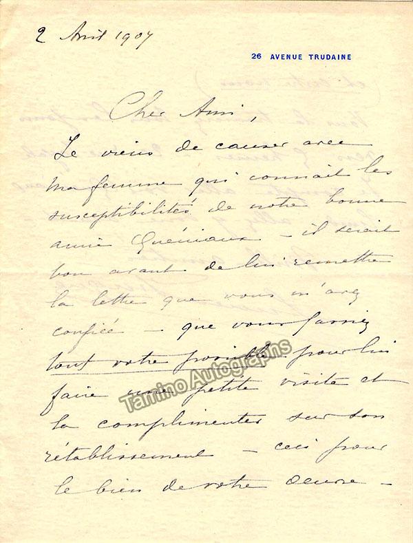 Set of 1 autograph letter signed, 2 folded pages, dated in 1907, sized at 5.25 x 7 inches, and 1 small signed card, size is 3.5 x 4.5 inches. Both written in French and sold untranslated, and in excellent condition. Not sold separately.
