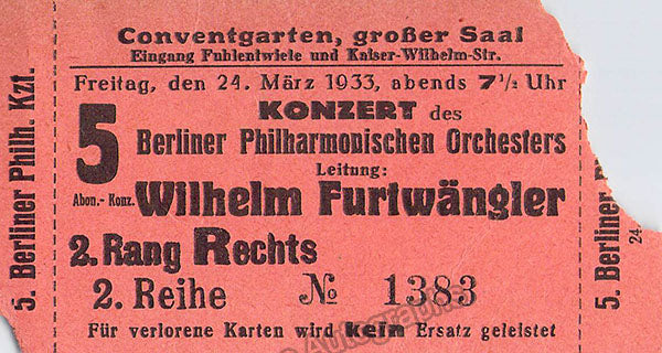 Ticket stub for a performance of the Berlin Philharmonic under the baton of the star German conductor in Hamburg, on March 24th, 1933.  Size is 3.75 x 2.1 inches, in excellent condition.