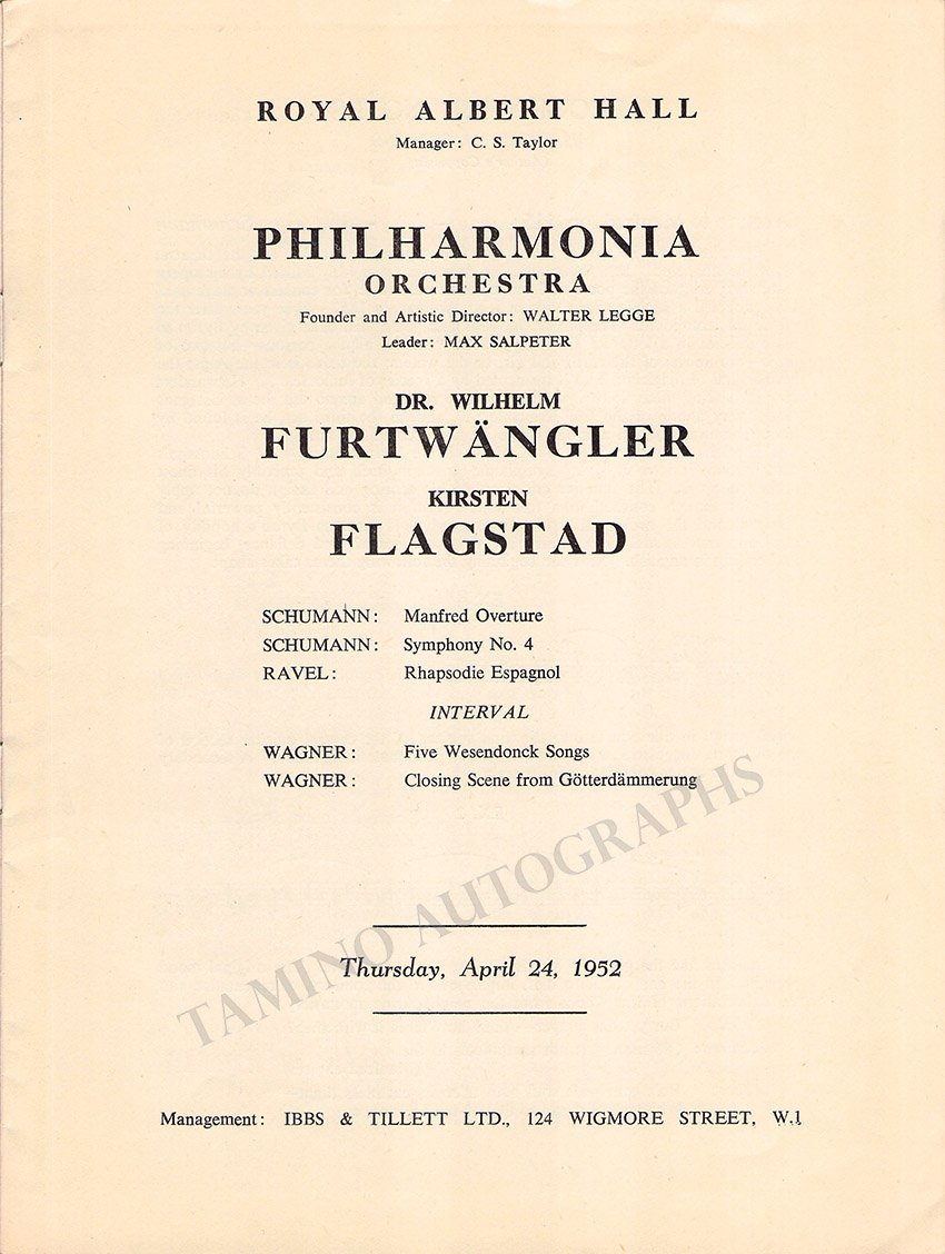 Program for a performance of the Philharmonia Orchestra under the baton of Wilhelm Fürtwangler with the Norwegian soprano Kirsten Flagstad as soloist at Royal Albert Hall in 1952.  Full program with all pages an covers. Size is 7.25 x 9.65 inches, in excellent condition.