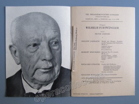 WF with the Berlin Philharmonic Orchestra. 15 February 1942, Berlin Jarnach: Music with Mozart Schumann: Symphony No. 4 Strauss: 4 Lieder (Peter Anders) and Don Juan. Paperback with full page portrait of Richard Strauss. Rare complete program of the German Reichsorchester during World War 2
