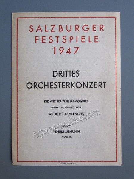 Furtwangler and the Vienna Philharmonic Orchestra. Salzburg Festival. 13 August 1947 Hindemith: Symphonic Metamorphoses Brahms: Violin Concerto (Yehudi Menuhin) Brahms: Symphony No. 1. First concerts after the war with the Vienna Philharmonic and with Yehudi Menuhin, who was as well the first foreign soloist to perform with Furtwangler. Rare