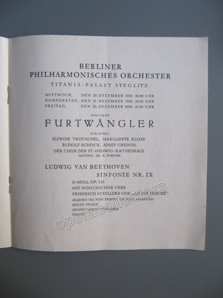 Furtwangler, Wilhelm and the Berlin Philharmonic Orchestra. 20/21/22 December 1950, Berlin - Beethoven: Symphony No. 9 with E. Trotschel, Klose, Schock, Greindl. Paperback with a portrait of Furtwangler.