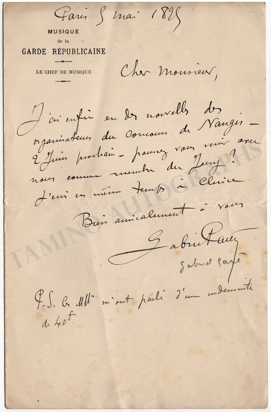 Pares, Gabriel - Autograph Letter Signed 1895 Pares, Gabriel - Autograph Letter Signed 1895