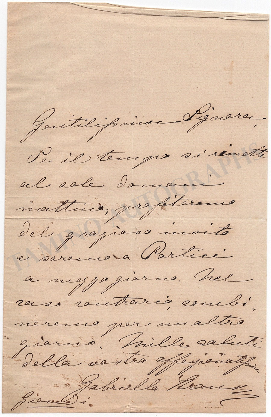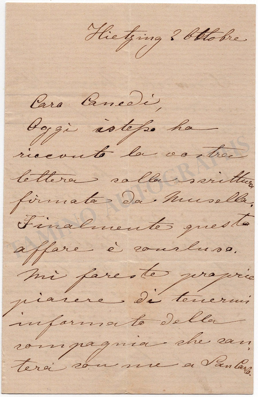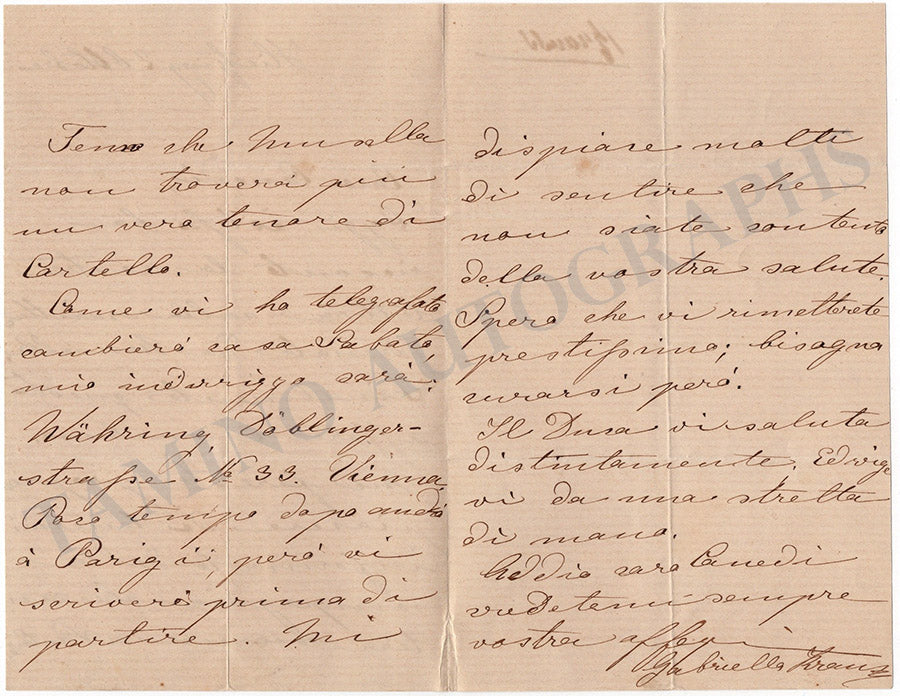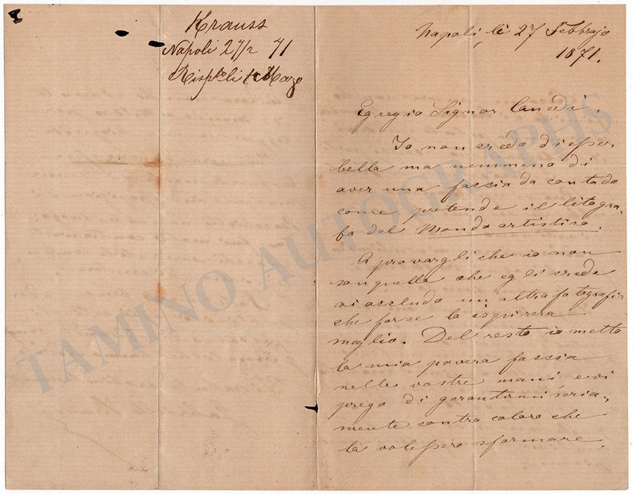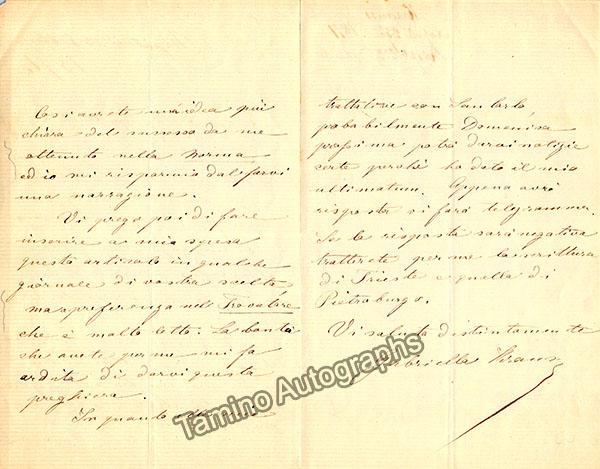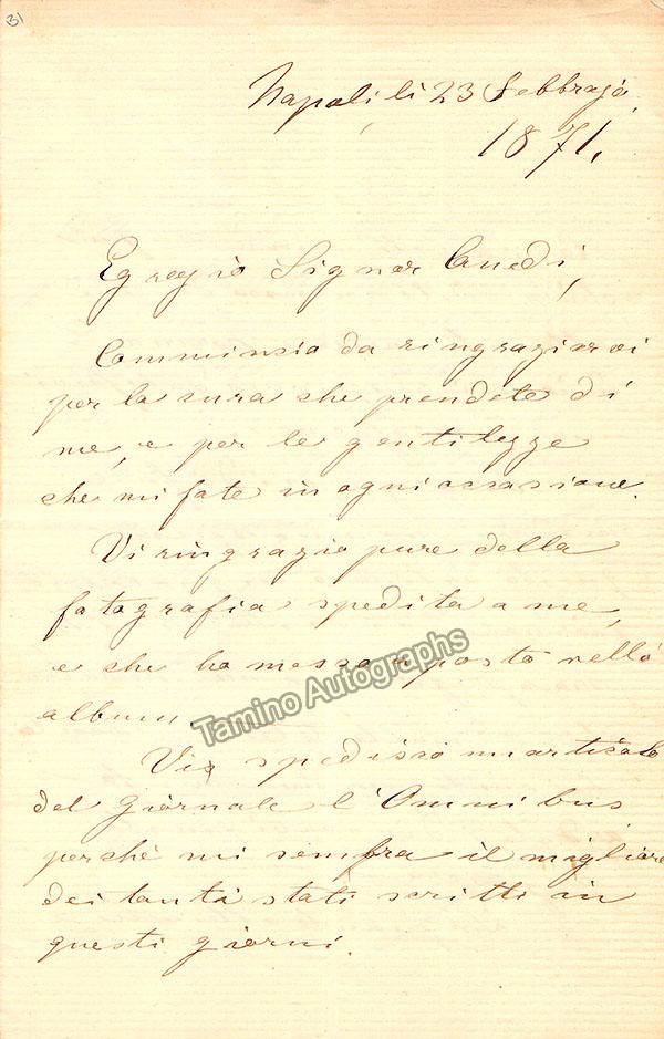 Autograph letter signed, composed in Naples, dated in 1871. 3 pages, written in Italian, sold untranslated. Size is 5.25 x 8.25 inches, in excellent condition, beautifully well-preserved.