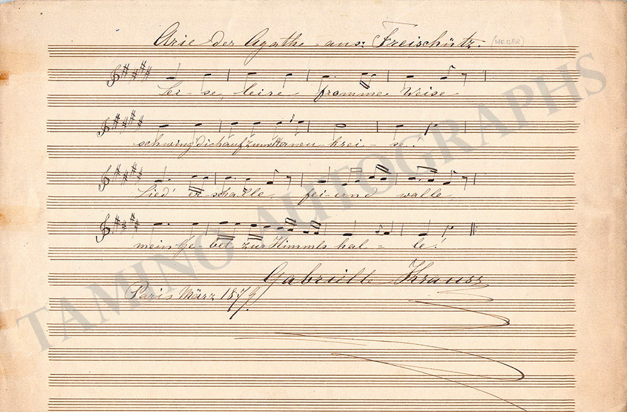 Autograph music quote from C.M. von Weber's opera Der Freischutz (Agatha's aria) written and signed by her in Paris, 1879. Size is 10.4 x 6.75 inches, minor stains, otherwise in very good condition.