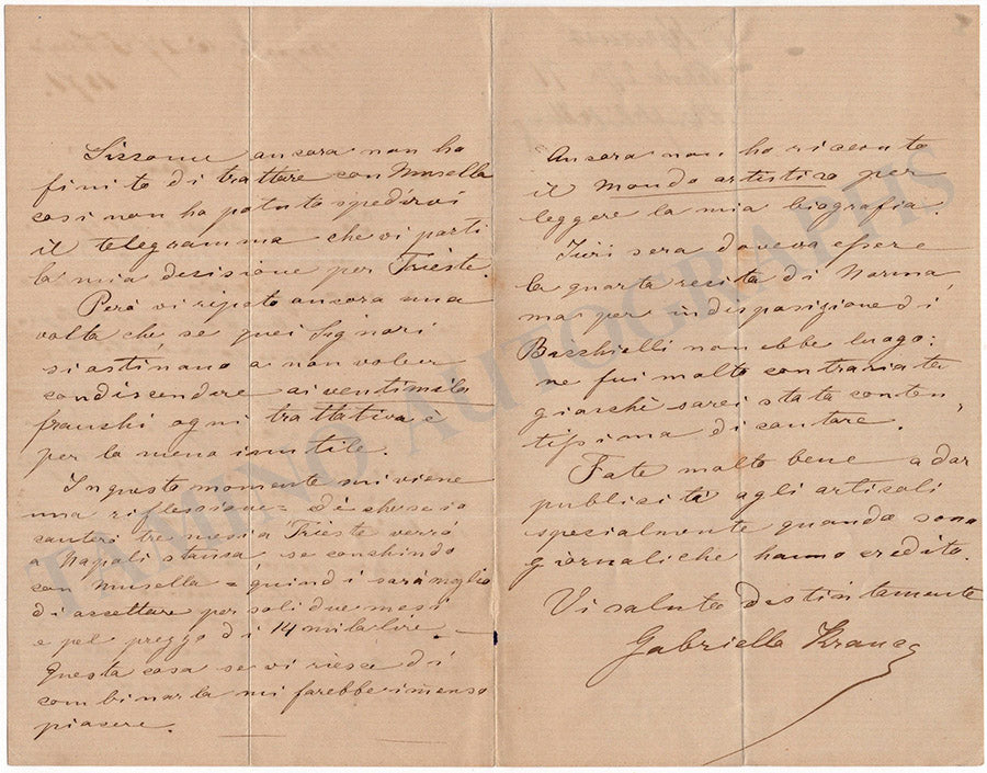 Collection of three autograph letters in Italian (untranslated) signed by her, one of them dated 1871, to the impresario Innocenzo Canedi, concerning newspaper articles and upcoming engagements.