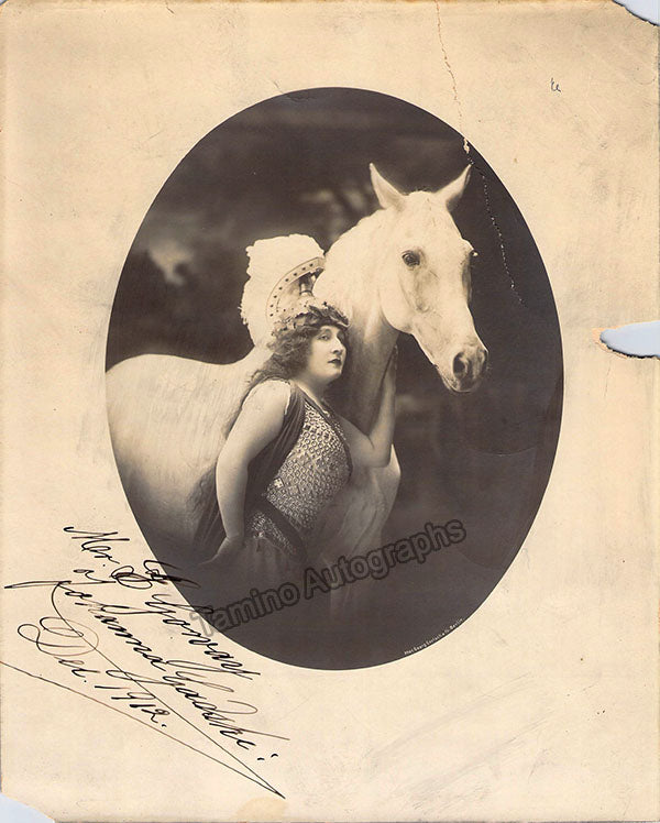 Signed vintage photograph shown in role (most likely Brunnhilde) in Wagner's Ring Cycle, inscribed and dated in 1912. Size is 8 x 10 inches, there is a crack to the right of the photo and 2 small ones at the top right and bottom left edges as well as mounting traces on verso, otherwise in good condition. Priced accordingly.