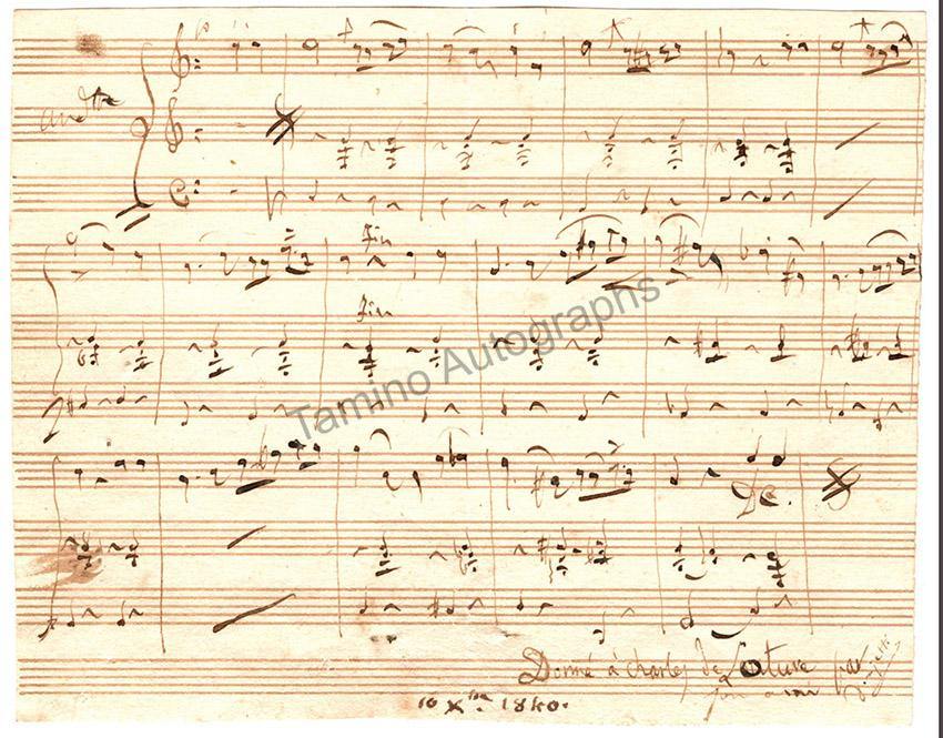 Wonderful autograph music quote signed by him, with 6 bars from an unknown piece, inscribed to Charles de Loture, "his friend", and dated in 1840. Signed as "Donizetti", a small piece, 5.6 x 4.5 inches, in excellent condition.