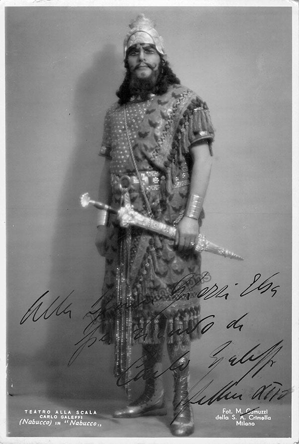 Leading Italian baritone (1882-1961), signed postcard photograph, shown in the title role of Verdi's Nabucco, inscribed. Photo by M. Camuzzi, La Scala, Milan. Size is 4 x 6 inches, in very good condition.
