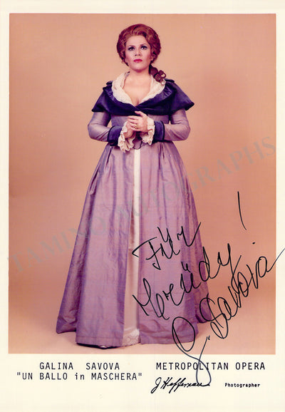 Nice color photograph signed by her, shown as Amelia in Verdi's opera Un Ballo in Maschera. Size is 5 x 7 inches, in excellent condition.