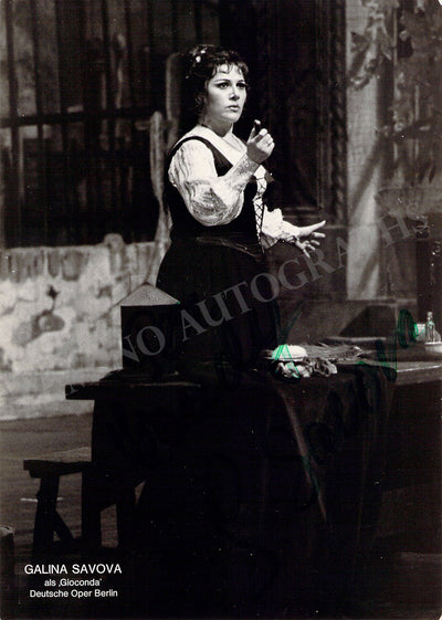 Nice black-and-white photograph signed and inscribed by her, shown as Gioconda in Ponchielli's opera; ink-stamped on verso by photographer Harri Irmler. Size is 4.1 x 5.75 inches, in excellent condition.