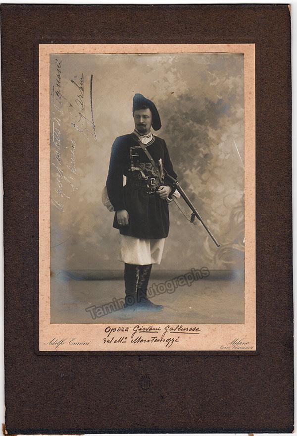 Signed photo shown in the title role of Montemezzi's Giovanni Gallurese, inscribed, mounted on a mat by photographer Adolfo Ermini, Milan.  Total size is 9 x 13.3 inches, actual photo is 6.4 x 8.3 inches, part of the ink has come off from the picture, some silvering on edges, a couple of scratches, in very good condition.  Rare!
