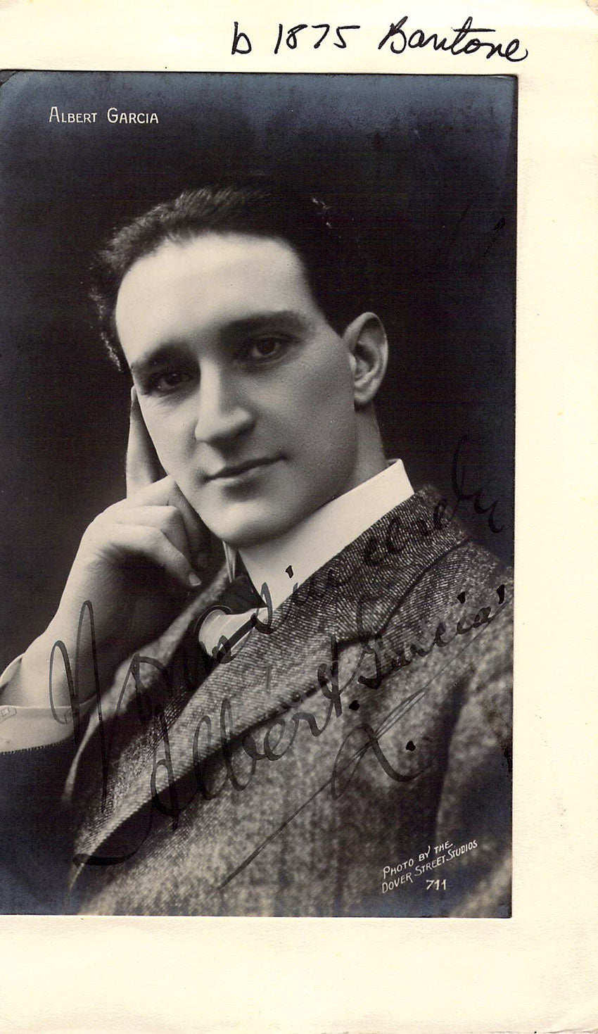 French baritone (1875-1946), great grandson of the famous tenor Manuel Garcia. Signed photograph, shown as himself, a photo by Dover Street Studios, London. Size of photo is 3.25 x 5.25 inches, mounted onto soft cardboard, total item size is 4 x 6.5 inches. Some silvering at the top of the photo, otherwise in excellent condition.