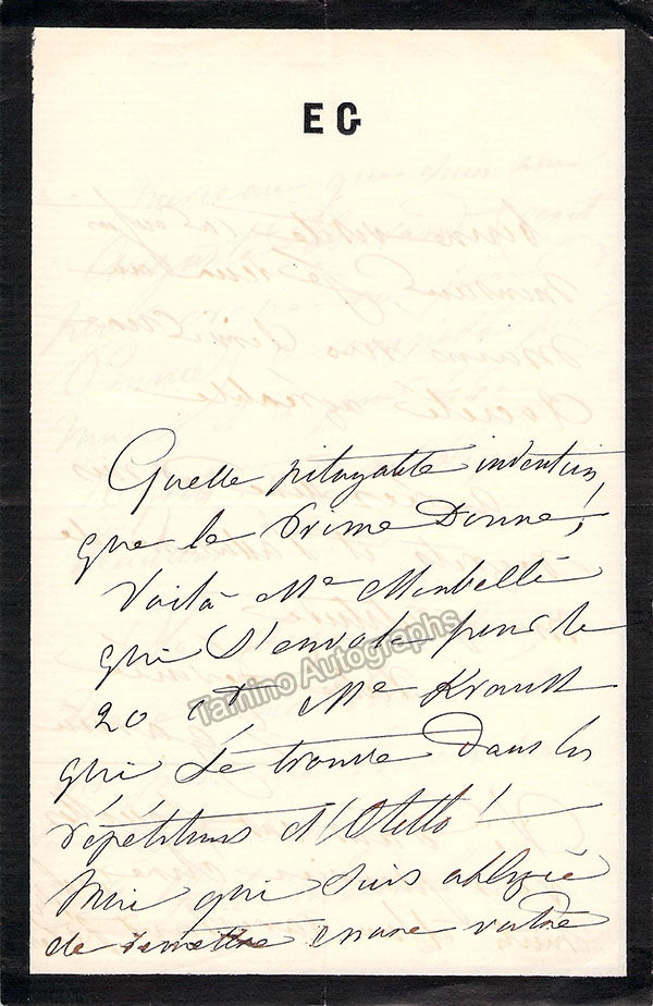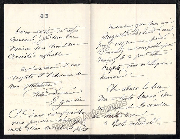Autograph letter signed, 3 pages on a folded 4 page document, embossed, written in French and sold untranslated. Signed as "E. Garcia". Clear and bold handwriting and signature. Each page is 5.25 x 8 inches, small folds but otherwise in excellent condition.