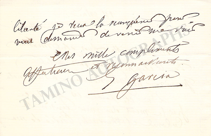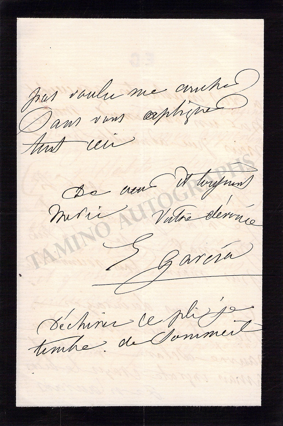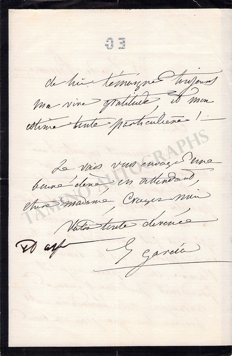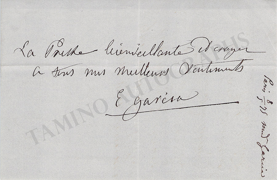Set of 4 autograph letters signed, each written in French and sold untranslated, three of these on embossed stationary. Signed as "E. Garcia". Clear and bold signature. Lengths of each letter range from 2 to 4 pages, most are 2 pages. Sizes range from 4 x 6 inches to 5.25 x 8 inches, several small folds but otherwise in very good condition.  Not sold separately.