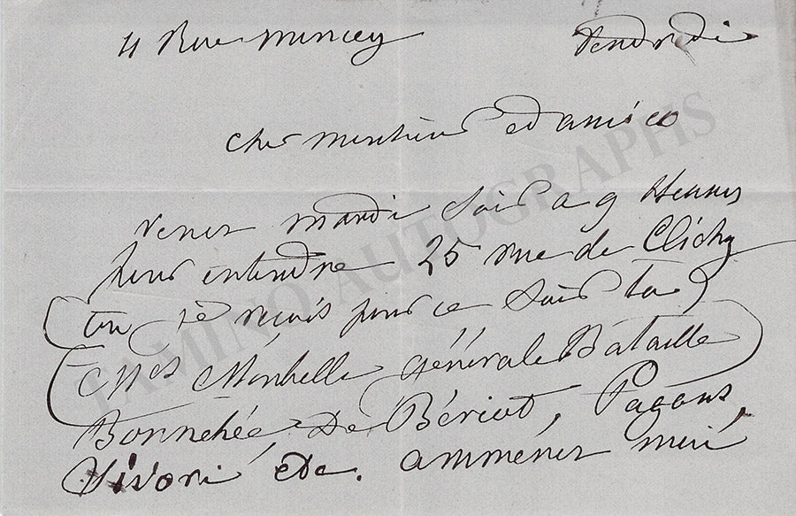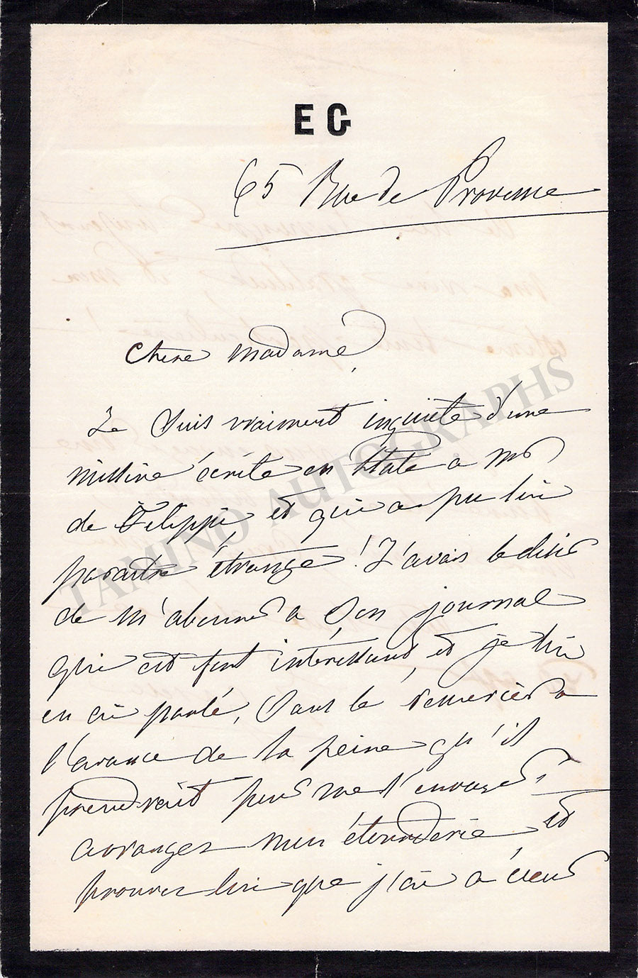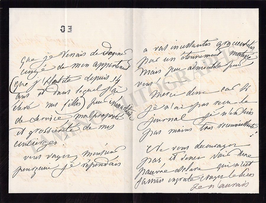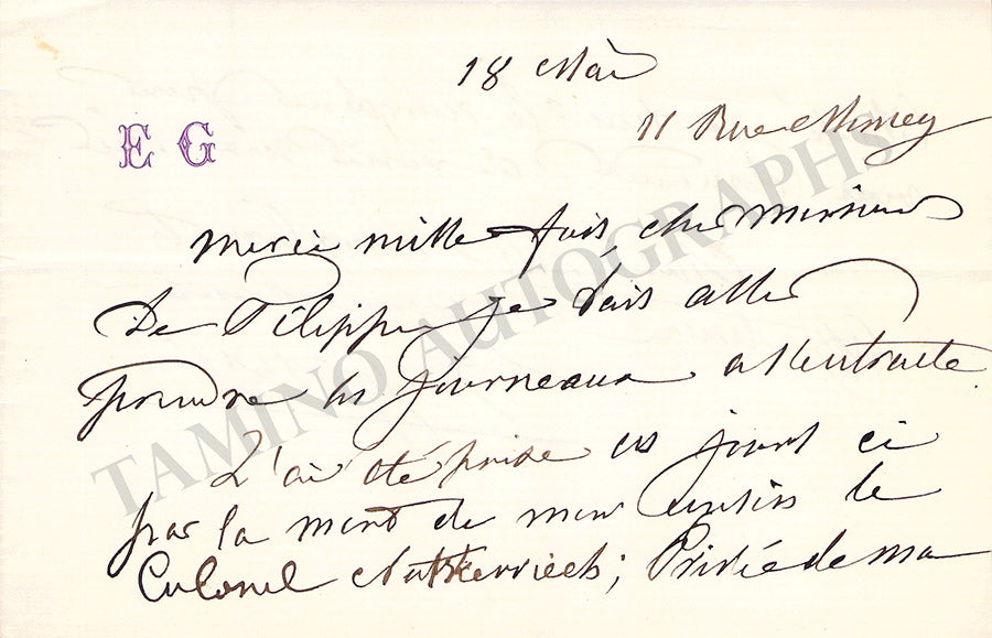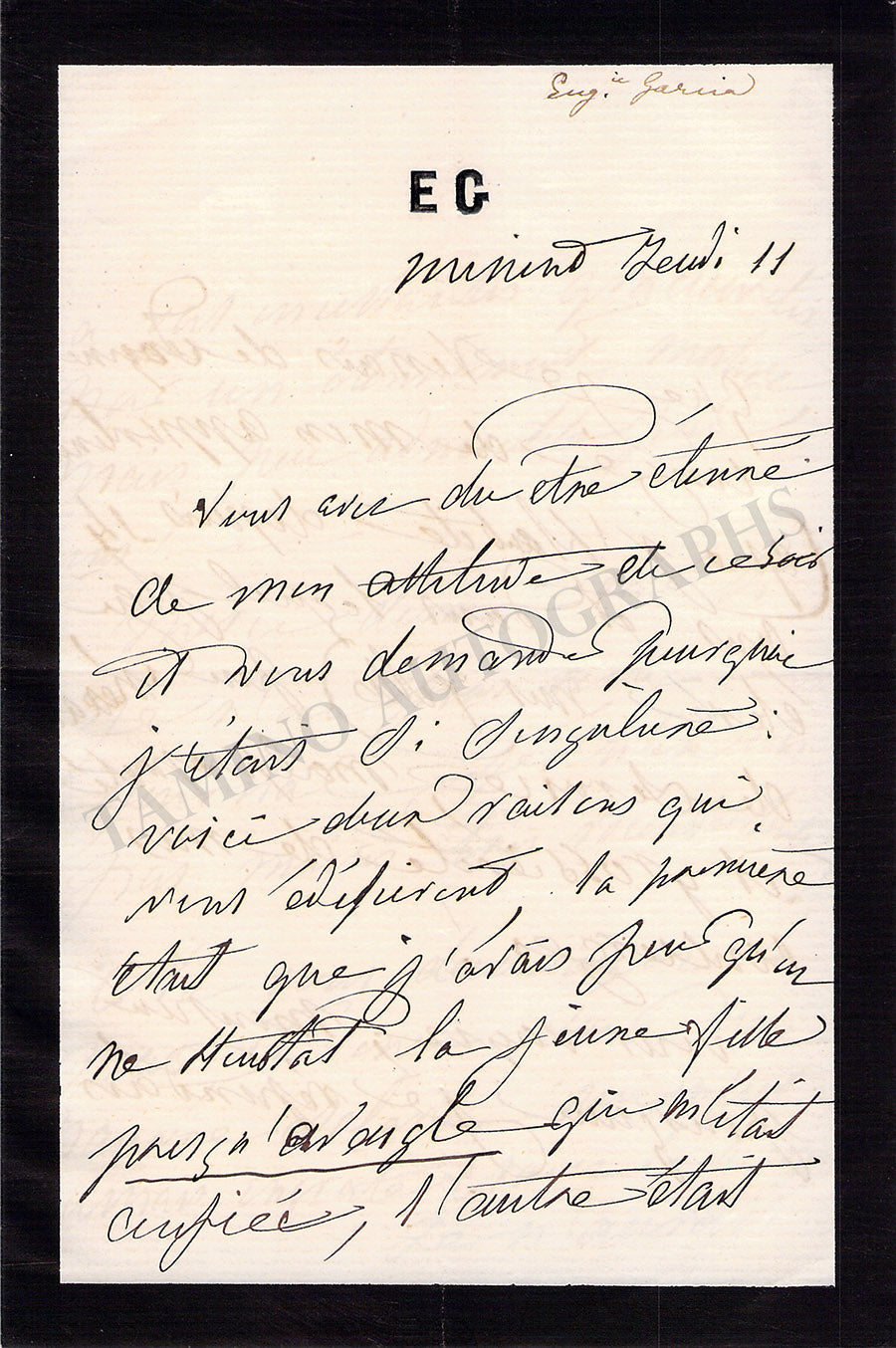 Set of 4 autograph letters signed, each written in French and sold untranslated, three of these on embossed stationary. Signed as "E. Garcia". Clear and bold signature. Lengths of each letter range from 2 to 4 pages, most are 2 pages. Sizes range from 4 x 6 inches to 5.25 x 8 inches, several small folds but otherwise in very good condition.  Not sold separately.