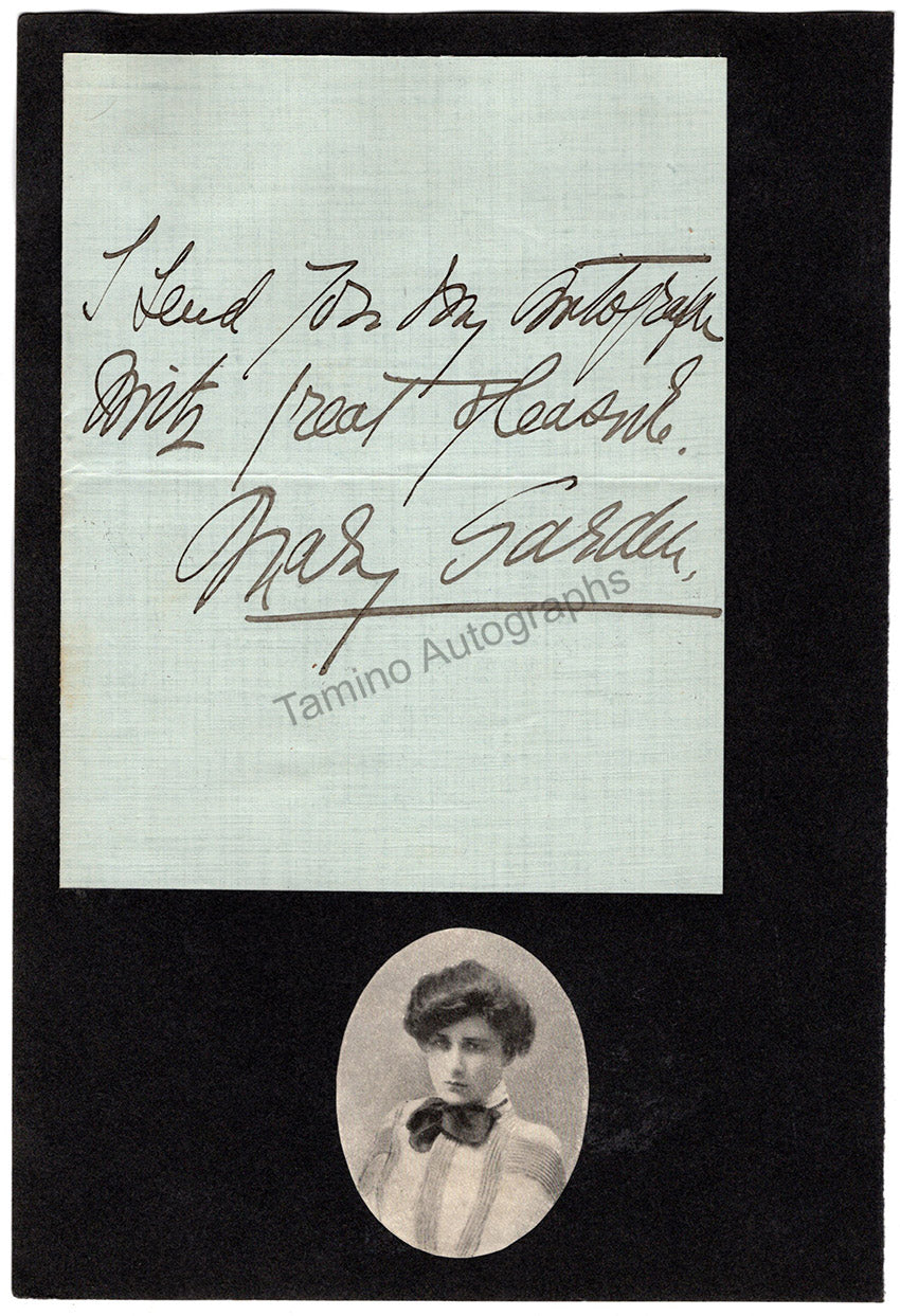Short greeting note signed by her on a page attached to an album page with a small portrait below.  Total size is 6.75 x 9.9 inches, mounting traces on verso, in excellent condition.
