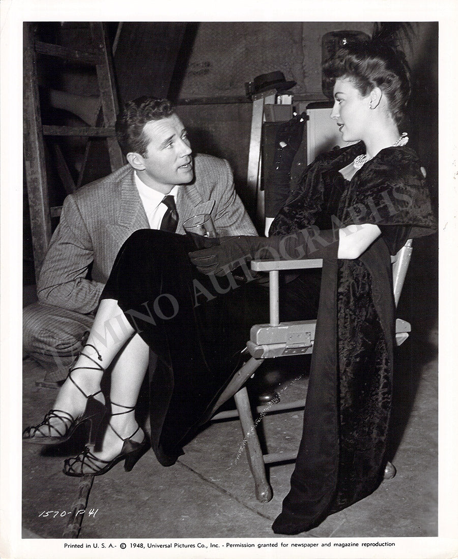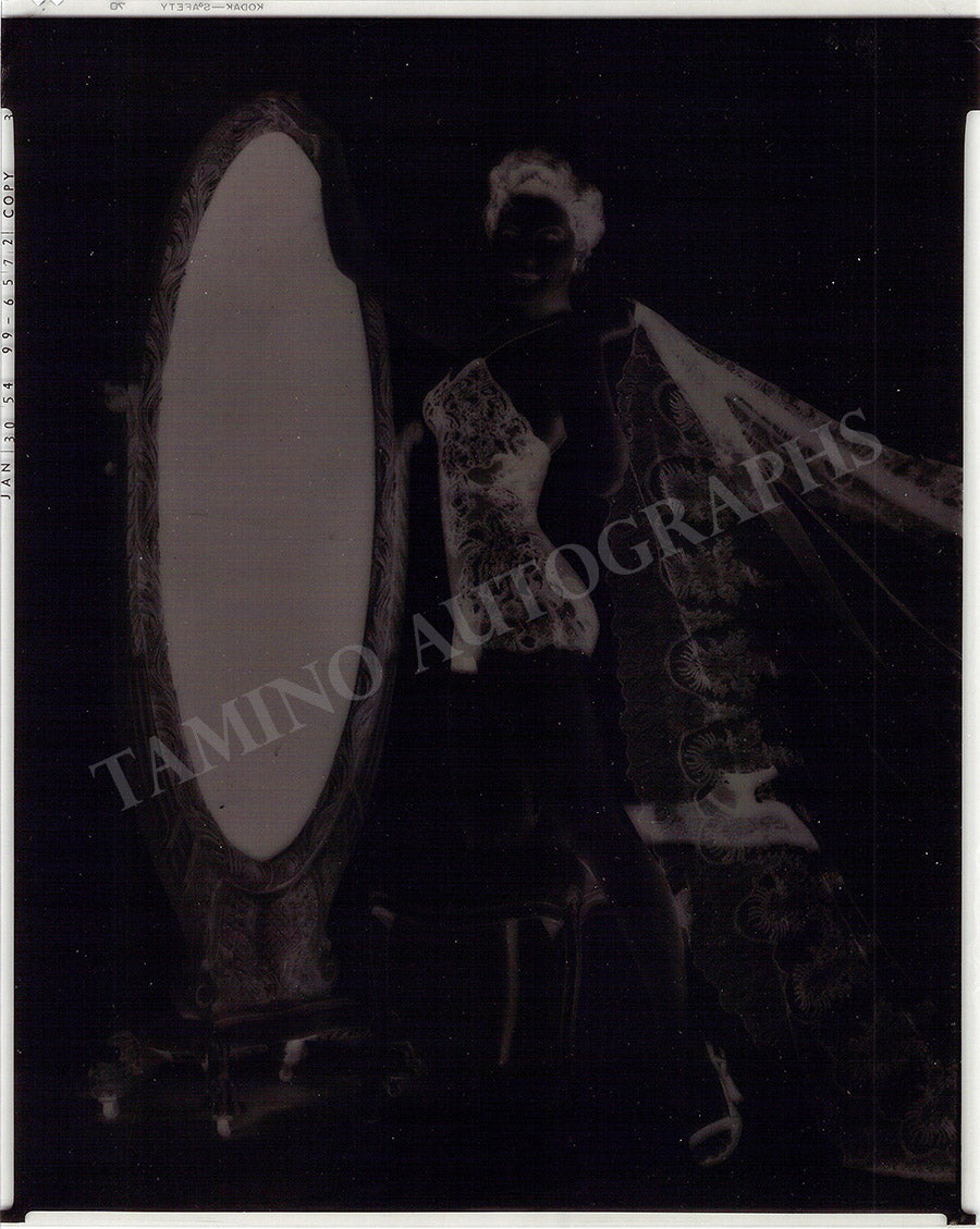 Small collection with 11 unsigned photographs of her, and one larger format negative. Three of the photos are small, showing her very young (information on verso indicates these were taken at age 16).  The first 5 shown here are 8 x 10 inches, last 3 are in larger format. Only one (picture nr 3, posing on a couch) is stamped on verso by a photographer (Seawell, Los Angeles). All in excellent condition.