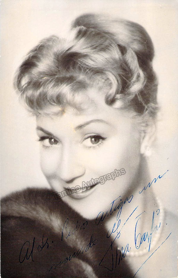 Mexican soprano (b. 1933), whose real name was Ernestina Garfias. She became a soprano stage and film/TV star in Mexico in the 1960s and also performed operatic roles for seven years in Europe under the pseudonym "Tina Garfi." Signed postcard photograph, shown as herself, signed as "Tina Garfi." Size is 3.5 x 5.5 inches, in excellent condition.