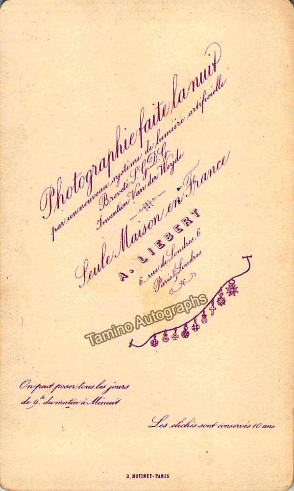Signed carte-de-visite, photo by A. Liebert, Paris. Size is 2.5 x 4.1 inches, in excellent condition.