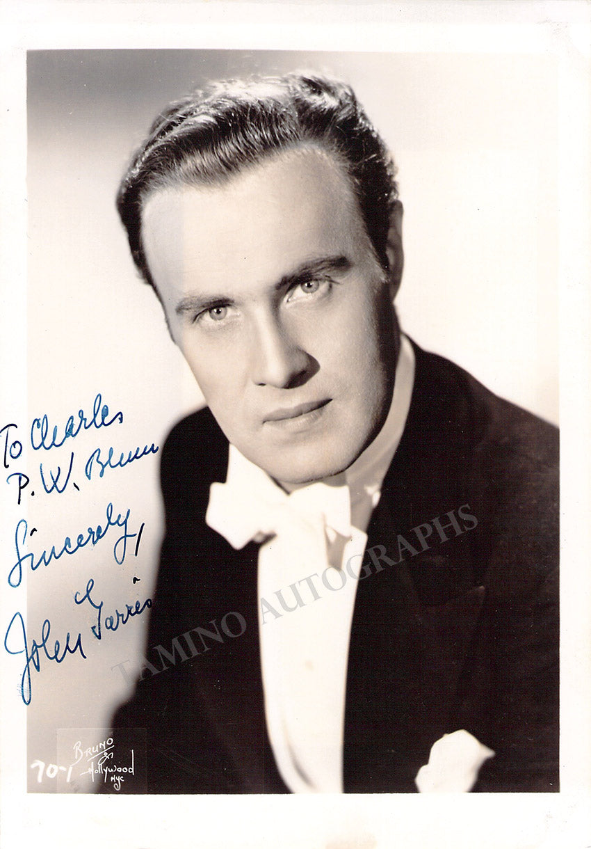 German-born American tenor (born Hans J. K. Gareis, 1913-1949), signed and inscribed photograph, shown as himself. Printed signature on front by Bruno of Hollywood, New York. Size is 5 x 7.25 inches, slight bends on each corner, otherwise in very good condition.
