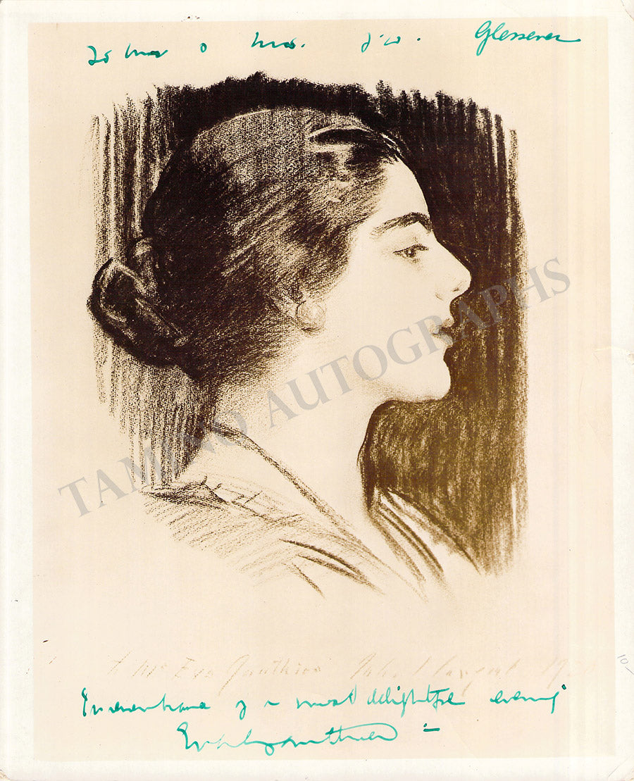 Nice photograph of a portrait signed by her with a short sentiment. Size is 8.1 x 10 inches, small crack over the right border, otherwise in good condition.