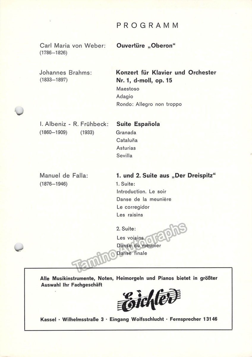 Program for a concert in Kassel, Germany, February 25th, 1966, performing Brahms piano concerto Nr 2. Size is 15 x 21 cm, 12 pages, storage holes not affecting signatures, otherwise in very good condition.